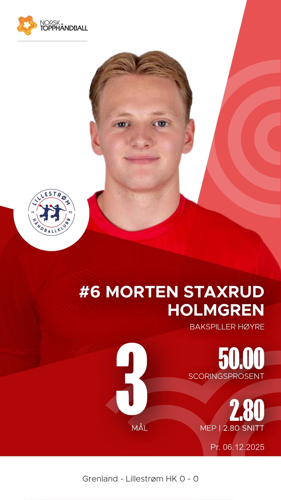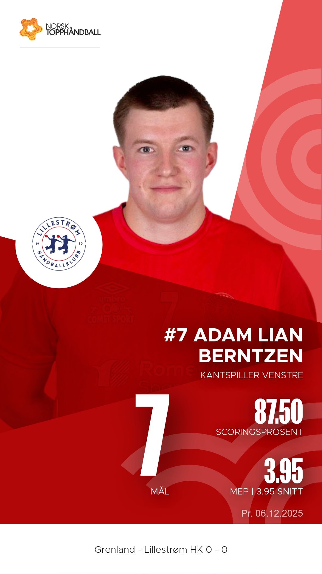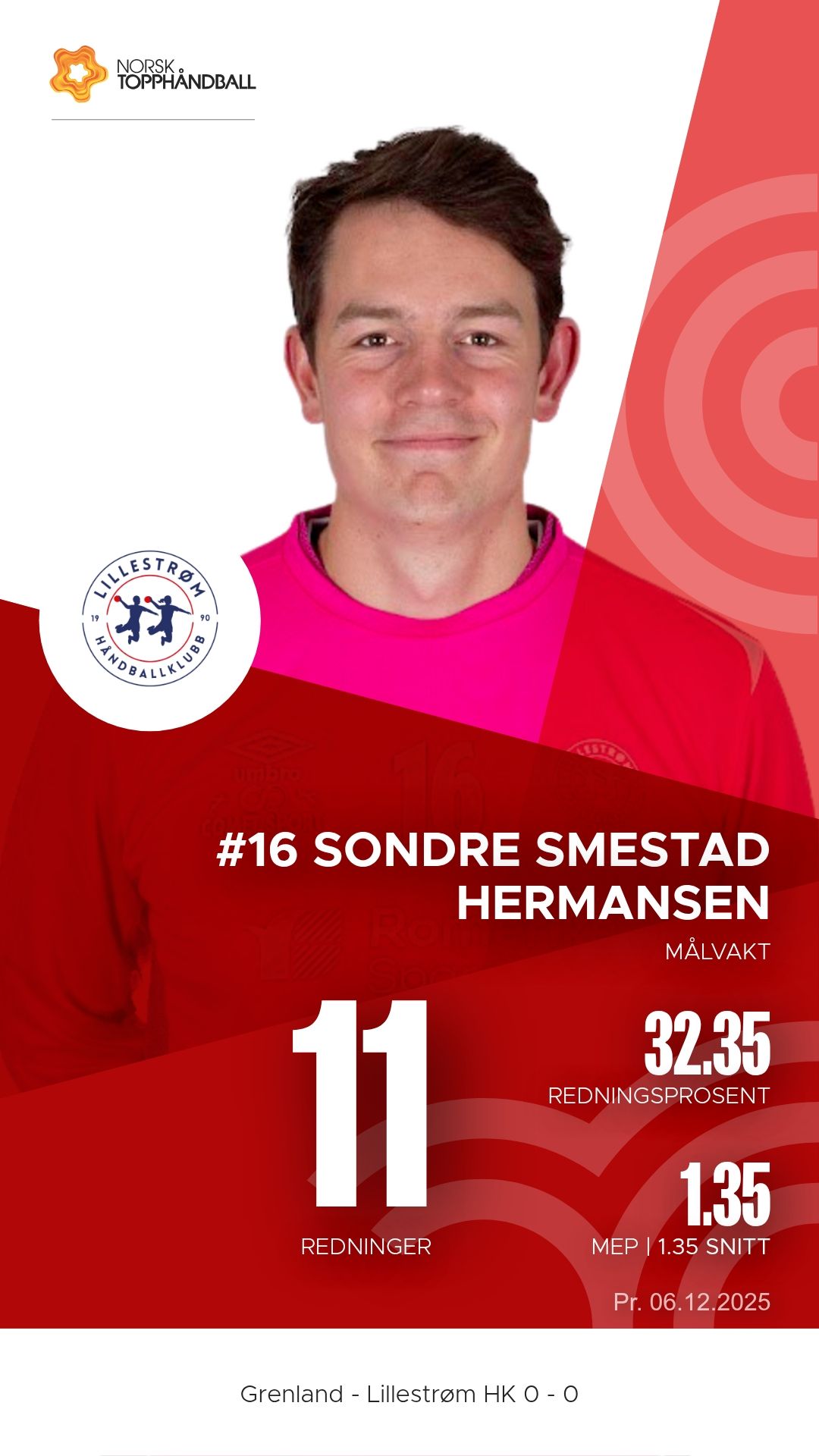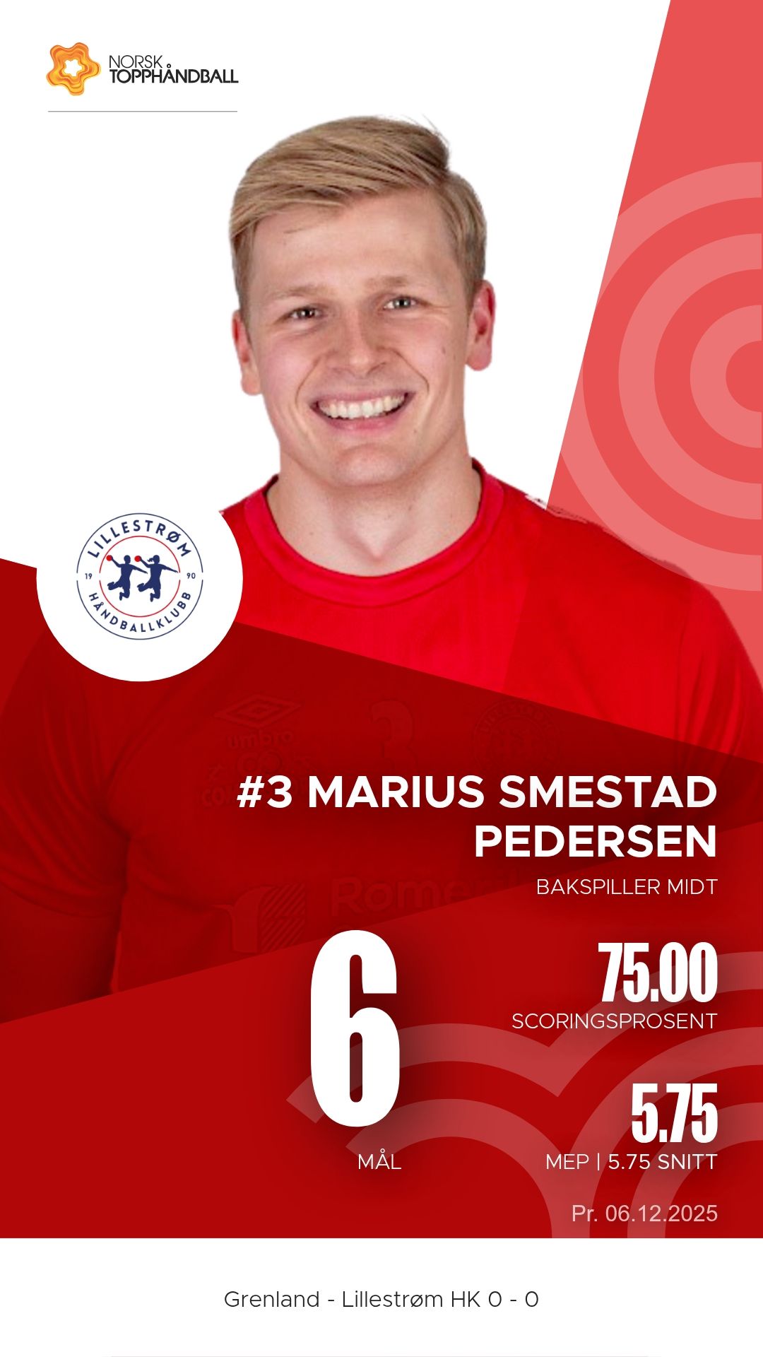 Grenland Topphåndballklubb tok imot Lillestrøm i Porsgrunn Arena lørdag 6. desember 2025 i 1. divisjon menn. Det ble en kamp hvor bortelaget fra Romerike viste større effektivitet og bedre struktur i både forsvar og angrep, og vant til slutt 34–29 etter å ha ledet 15–14 ved pause.